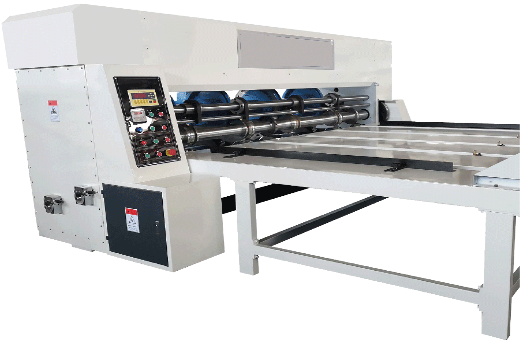This machine is used for cutting, Creasing Slotting and corner cutting of corrugated board simultaneously. Four Creasing, Two side cutting, Three slotting and one corner cutting heads are provided. The machine has a chain delivery arrangement. Slot depth is 300 mm and maximum output 60 sheets per minute. Available machine width: 1800-3000mm
